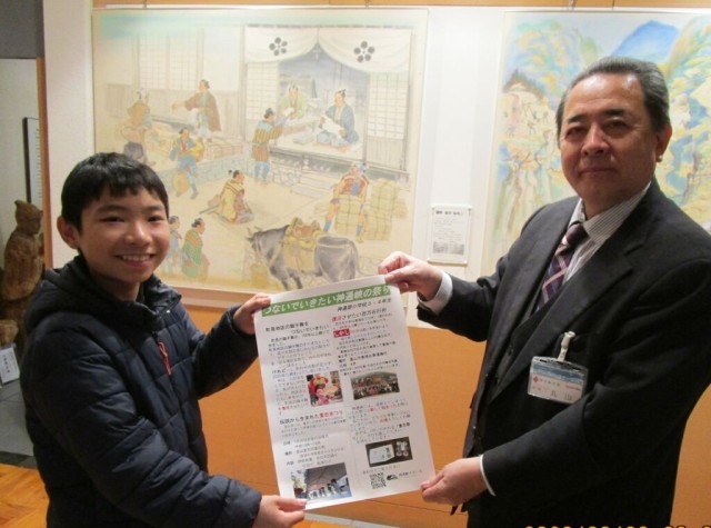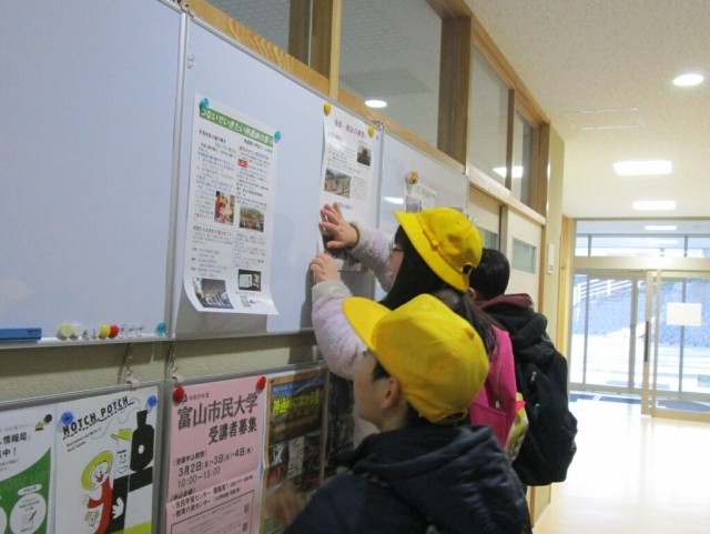 JRに乗って、神通峡南部へ。3・4年生が総合的な学習の時間に作ったポスターやパンフレットを掲示していただくお願いをしに、地区センターや関所館、公民館等を回りました。