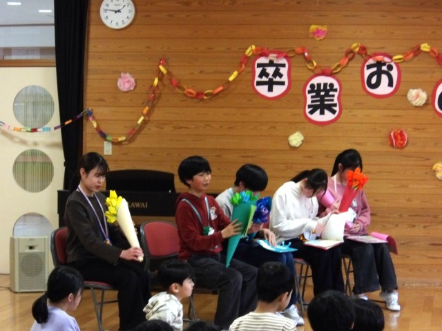 4年生の出し物は、卒業生との対決です。縄跳びやけん玉対決等卒業生に花を持たせた結果がほほえましかったです。対決に勝った卒業生は、4年生から勝利のメダルを受け取り、誇らしげでした。