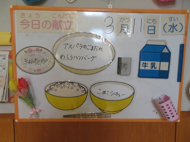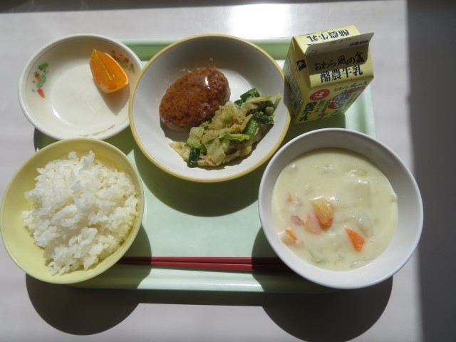 今日の献立は、ご飯、牛乳、和風ハンバーグ、アスパラのごまだれ、米粉シチュー、清見オレンジです。
