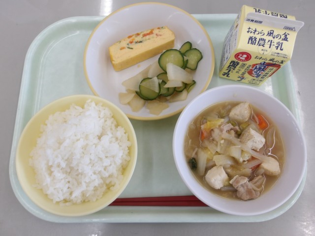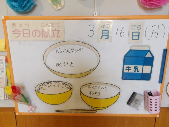 今日の献立は、ごはん、牛乳、千草焼き、大根サラダ、韓国風すきやきです。