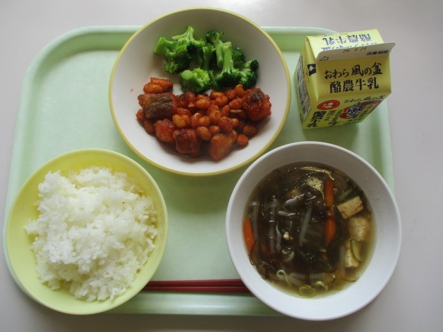 今日の献立は、ご飯、牛乳、ホキと大豆のマリアナソースからめ、ゆでブロッコリー、豆腐ともずくのスープです。