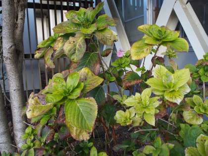 暖かさのせいか、校庭のあじさいに花が一輪咲いていました。
