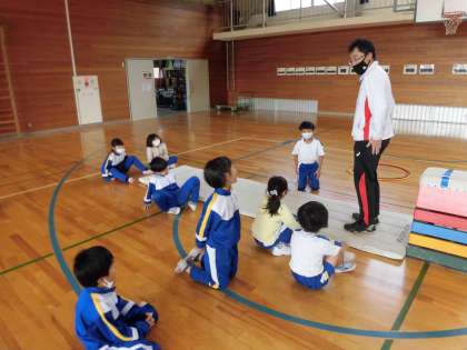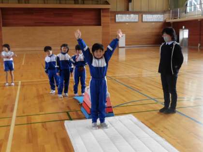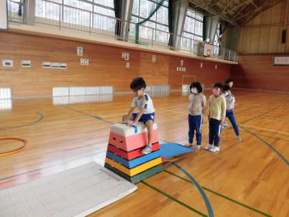 昨日よりレベルアップしました。3段と5段の跳び箱に座る形で跳びのり、そこからの跳びおりの練習をしています。手でしっかり跳び箱を押して跳びおります。