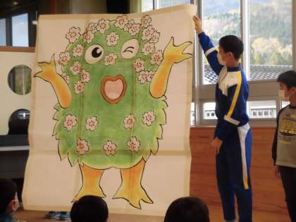 2番の「人権ミドりんの花運動」では、人権を意識した行動を振り返り、自分と友達のできたことを花のカードに書きます。そして、書いたカードをミドりんに貼っていきます。