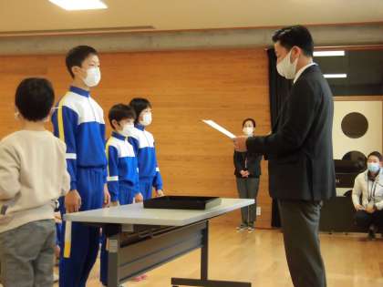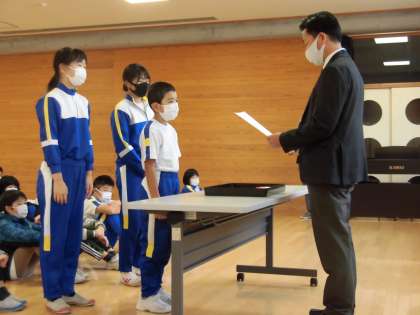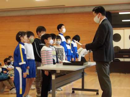 防火ポスターコンクールの努力賞に入選した3名と、みどりっ子マラソンの各部門で入賞した子供たちに校長先生から賞状が渡されました。