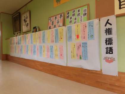 全校児童が、人権について標語をつくりました。2階渡り廊下に展示してあります。