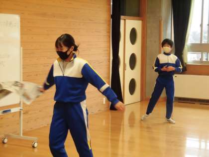 ペアになって、1人は持っている新聞紙を破いたり動かしたりします。もう1人は、その新聞紙の動きから想像を広げて、身体表現をします。恥ずかしからず、自由に想像を広げ、おもしろい動きをたくさんすることができました。
