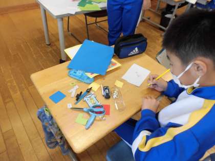 5限に4年生は、色画用紙を切ったり貼ったりしながら、飛び出すカードづくりに取り組んでいました。
