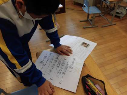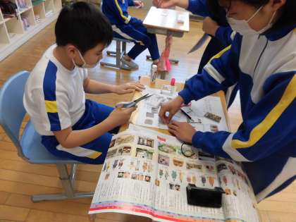 6年生は、グループごとに、日本の歴史のパンフレットを作成しています。「衣服」や「楽器」など、視点を決めてまとめています。国語で学習した「読者に伝えるための工夫」を取り入れながら仕上げています。お互いにつくっているものを見合って、よりよいものにしようとしています。もうすぐ完成です。
