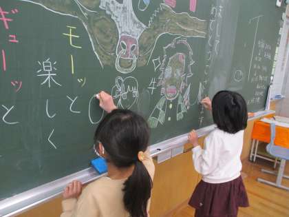 休み時間に、先生の絵の隣に 新しい絵を付け足しました。