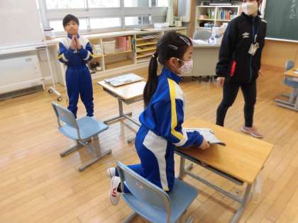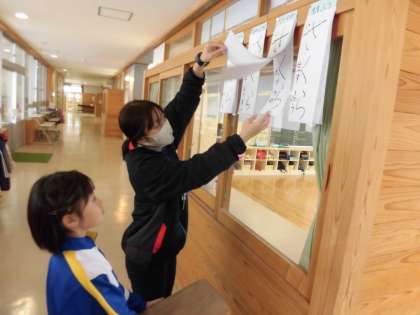 1年生は、友達の作品やこれまでの練習と見比べて、自分や友達の成長を確認していました。