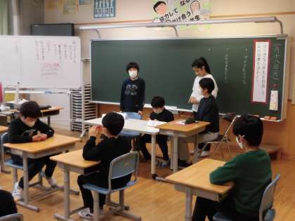自分たちで司会や黒板書記などの係を分担しています。また、「すてきな3年生」を目指して、積極的に発言していました。