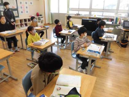 1限、3年生は理科を行っています。豆電球に明かりをつけるには、乾電池とどのようにつなげばよいのか、実験をして確かめていました。+極と-極という言葉も勉強しましたね。