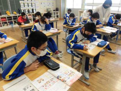 1限、5年生は家庭科で、家族の時間の過ごし方について話し合っていました。