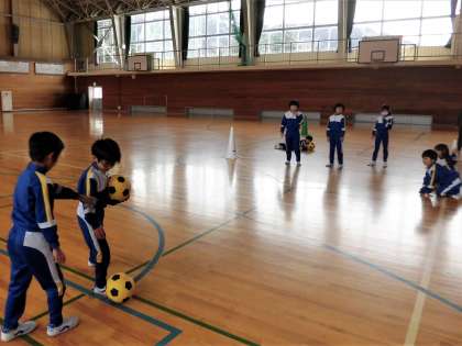 サッカーボールを蹴って、相手の陣地に入れるゲームをしました。