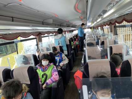 バスの中はマスクを着用し、しゃべらず過ごしています。