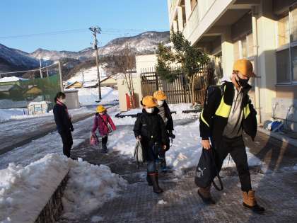 太陽が顔を出すまでは、空気が冷え切っており、路面も、凍っているところが多くありました。子供たちは滑らないように気を付けて歩いていました。