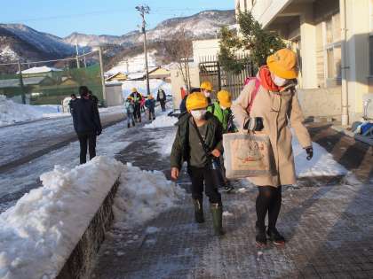 太陽が顔を出すまでは、空気が冷え切っており、路面も、凍っているところが多くありました。子供たちは滑らないように気を付けて歩いていました。