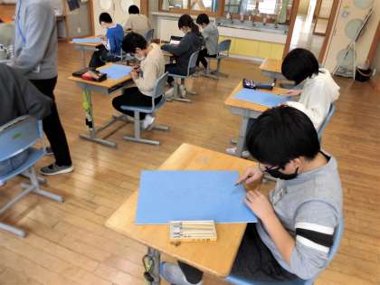 自分の顔の特徴を捉えて下絵を描きました。ケガをしないように丁寧に彫り進めています。