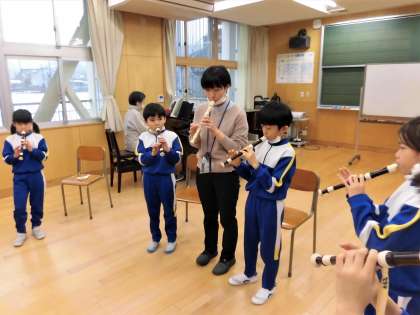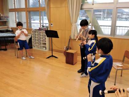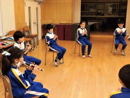「今日は、何回吹きたい?(練習したい?)」と先生に聞かれて、「20回」「ぼくは30回」と答えるやる気満々の子供たちです。結局、みんなで11回練習することになりました。続けていくうちに、みるみる指使いが上手になってきました。