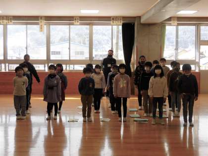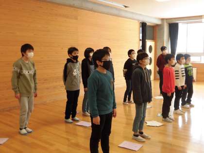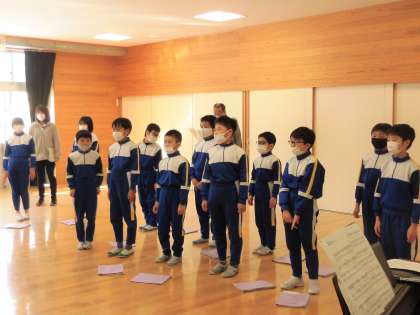 1年生から5年生で、卒業式に歌う在校生の歌「おくりもの」と2月の歌「ありがとうの花」の練習をしました。