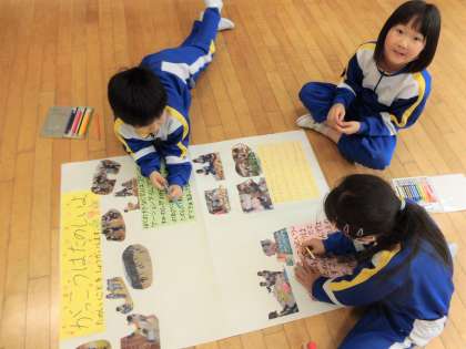 1年生は、4月に入学してくる保育所年長組のみんなに、学校を紹介するための掲示物をつくっています。