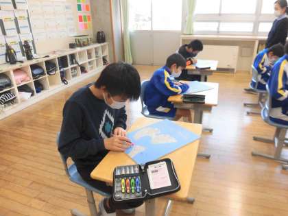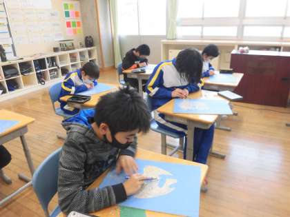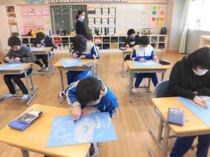 自画像を彫っていますが、ほっぺやあごのあたりを曲線状に彫るようにみんながんばっています。力作揃いです!