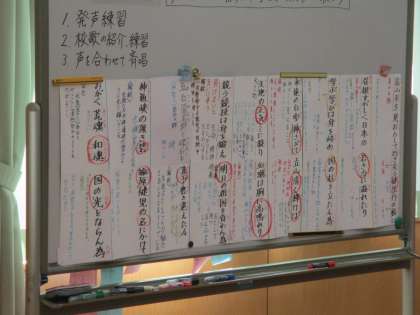 楡原中学校2年生の4人と一緒に校歌の練習をしました。
