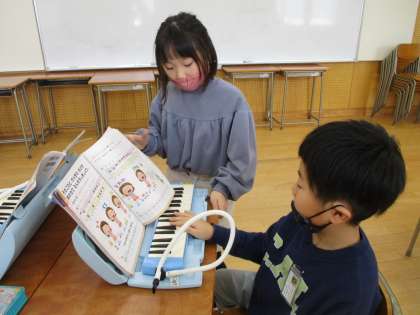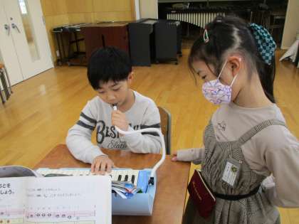 今日は、鍵盤ハーモニカの指番号を友達と見合いました。