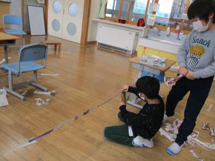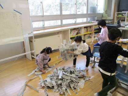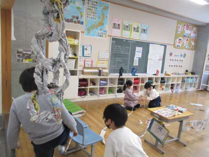 新聞紙や広告をどんどんつないで、教室につるしました。
