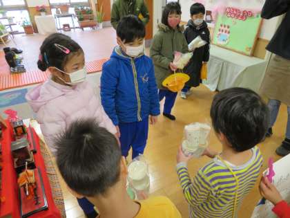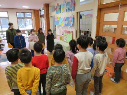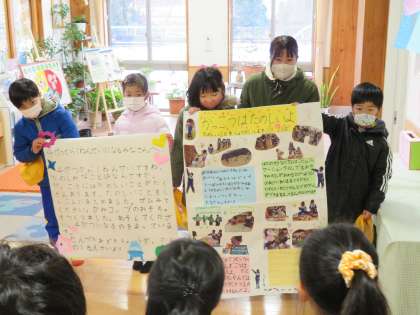 年長の皆さんが、来年度から楽しみな気持ちで学校に入学してほしいと願いを込めて、おもちゃや手紙、紙新聞等を作ってきました。