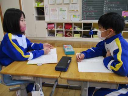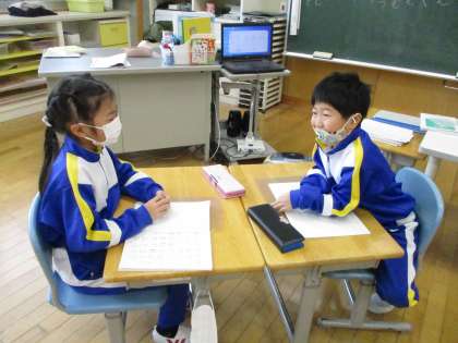 二人ペアになって、問題を考えています。ヒントはどんな順番で言おうかな。