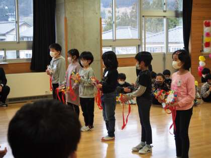 卒業を祝う会のプログラム2番は、2年生による「プレゼント渡し」です。
