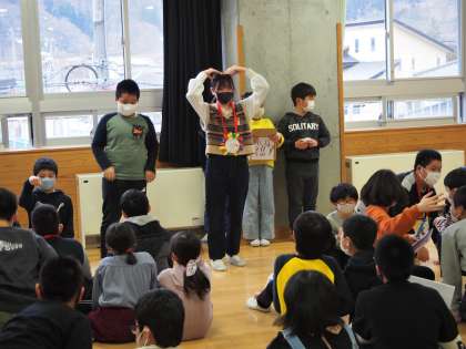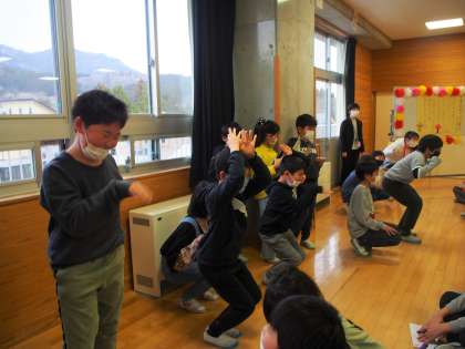 縦割りグループ班で、代表者が体を動かして答えを表現します。
