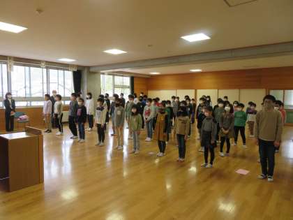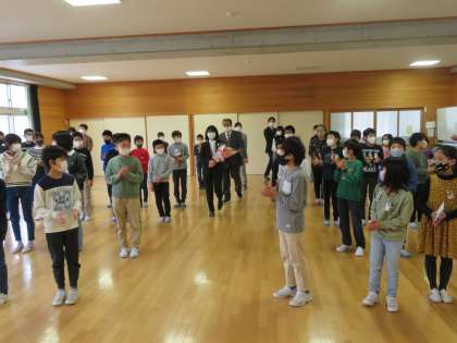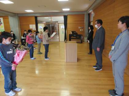 子供たちが感謝の言葉と花束を贈りました。最後に「ありがとうの花」を歌って転出される先生方を見送りました。