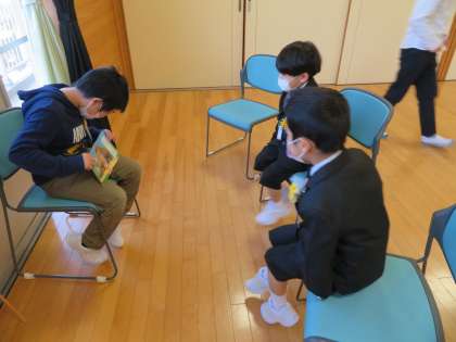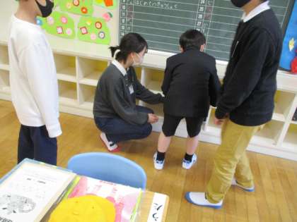 6年生は、1年生に優しく話しかけたり、絵本を読み聞かせたりしました。