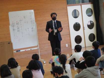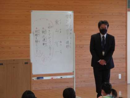 今日、栗山有一先生が着任されました。自己紹介では、毎日運動をされていることや問題を解くことが好きなど、ユーモアたっぷりに話されるので、子供たちは、あっという間に先生の名前と顔を覚えることができました。