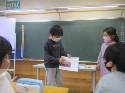 総合的な学習の時間に、自分たちの地域で有名なものについて話しています。