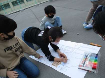 屋上から学校の周りの建物や自然を見て、絵地図に知っている場所を記入していく3年生。地図で、新たなポイントを発見する表情は、とてもにこやかでした。