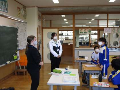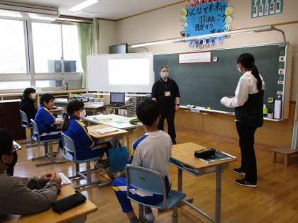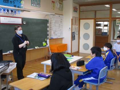 今日から新しいALTエミリー先生が赴任されました。早速、4時間目には6年生と一緒に授業を行い、エミリー先生の出身地アメリカの話を聞いたり、子供たちも自己紹介をしたりするなど、楽しい外国語の時間が始まりました。