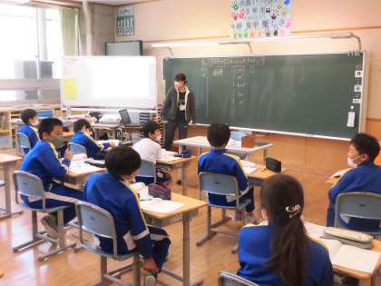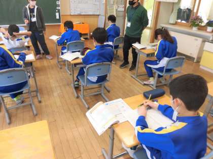 一人の意見をもとに、みんなで考えています。真剣に考え込むと、にぎやかな5年生も声が出なくなり、シーンとなります。さて、答えは出たのでしょうか。