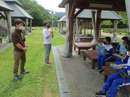 総合的な学習の時間で、共生をテーマに、天湖森をいろいろな人に楽しんでもらおうと学習を進めています。実際に天湖森に行き、スタッフの西村さん、中村さんの天湖森に対するおもいや願いを聞いてきました。学校に帰って振り返りを行い、自分たちにできることを考えました。