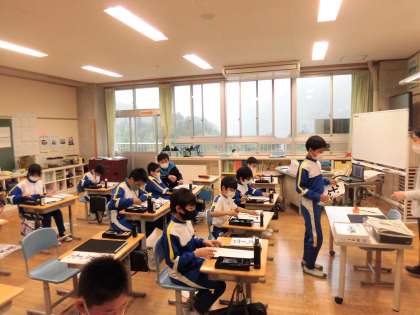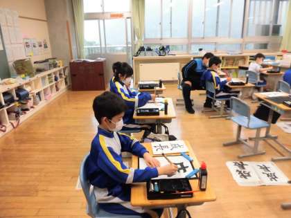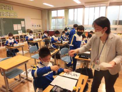 5年生は、教頭先生と一緒に習字の学習をしていました。