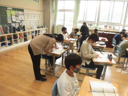 自分の生活習慣(毎週行っていること)について、英語で伝える学習でした。子供たちは、自分の書いた文に賞賛の言葉やアドバイスをもらいながら、満足げな様子でした。