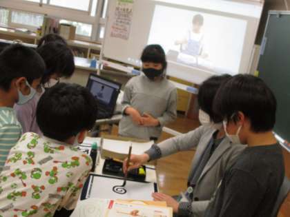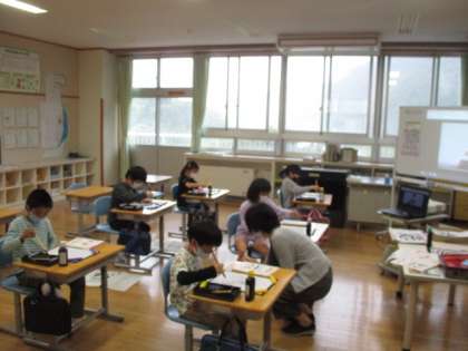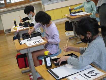 昨日から引き続き、書写で毛筆を学習する3年生。墨汁のつけ方、筆の軸の立て方に気を付けています。