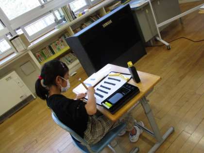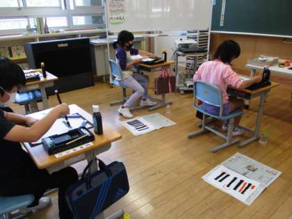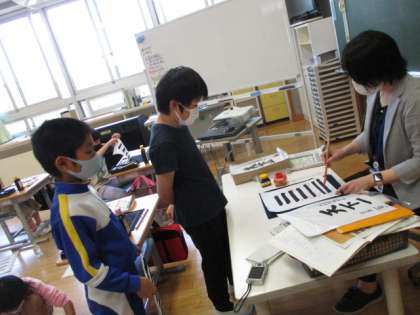 毛筆で横画に挑戦する3年生。始筆から終筆までを集中して書く姿がすてきです。