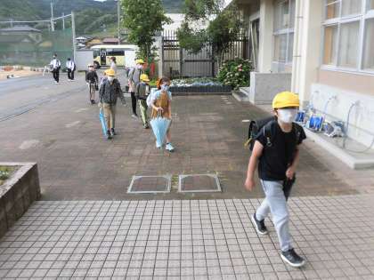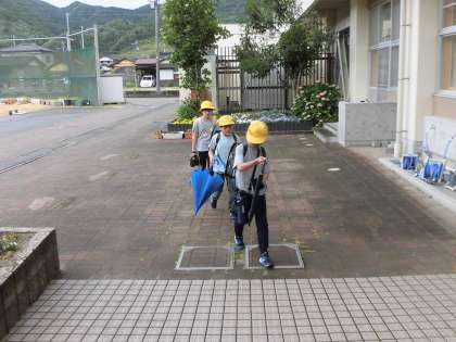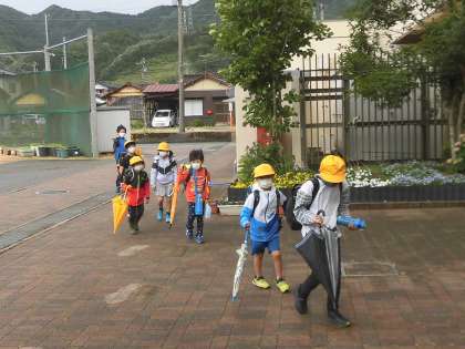 子供たちは、玄関に向かって向かい風の中を歩いてきます。