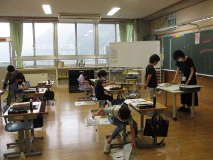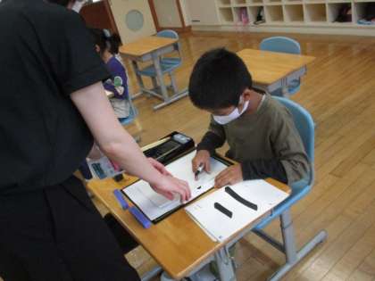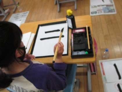 横画を書くときに、筆の動き方を意識している3年生。練習に集中して、すてきな「二」の字を目指します。