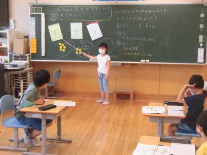 6月9日(水) 1年算数「ひき算」 公開日 2021/06/09 更新日 2021/06/09 1年生の部屋 「袋の中のお菓子を食べた後、どの袋に入っているお菓子が一番多いでしょう?」 どう考えたらよいか、どんな式を立てたらよいか、みんなで意見を出し合いながら考えていました。発表や友達の意見を聞くことがとても上手な1年生です。