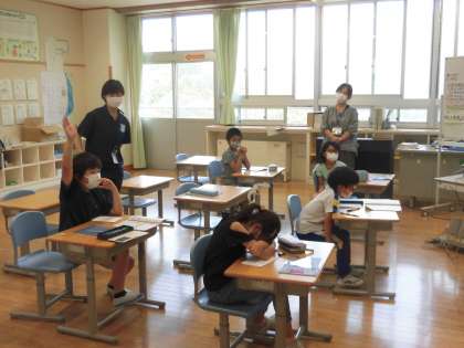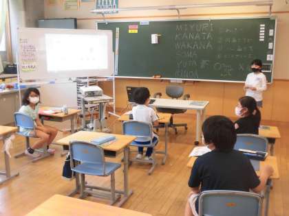 6月9日(水) 3年外国語活動 公開日 2021/06/09 更新日 2021/06/09 3年生の部屋 外国語活動で、漢字当てクイズを行っています。 何画の漢字か?ヒントは? クイズを楽しみながら、英語で会話をしていました。